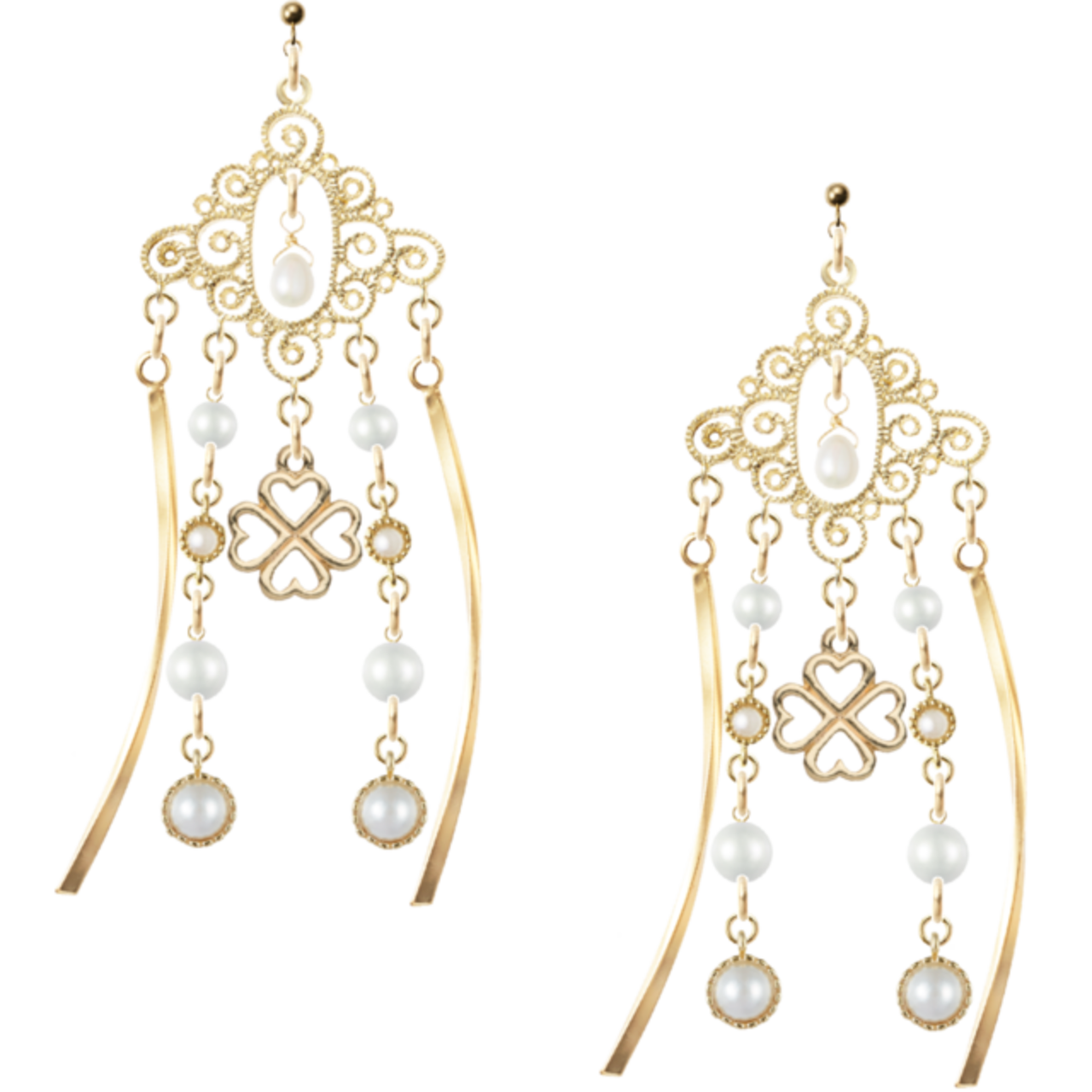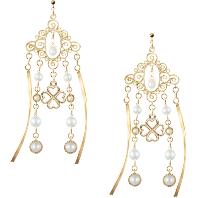 淡水パールと樹脂パールを使用した、やさしい色合いのオリエンタル透かしシャンデリアが主役です。ウエーブバーとの組み合わせが、より一層女性らしさを引き立てます。また、丸玉カン付きで簡単につけ外しができるので、忙しい朝にもピッタリ。