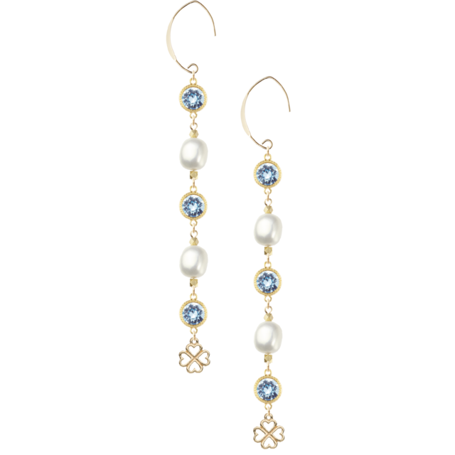 14KGFフックピアスに、スワロフスキーラウンドアクアマリン、樹脂変形パールアーモンド、型抜き四葉のクローバーが組み合わさり、軽やかな印象に仕上がっています。
